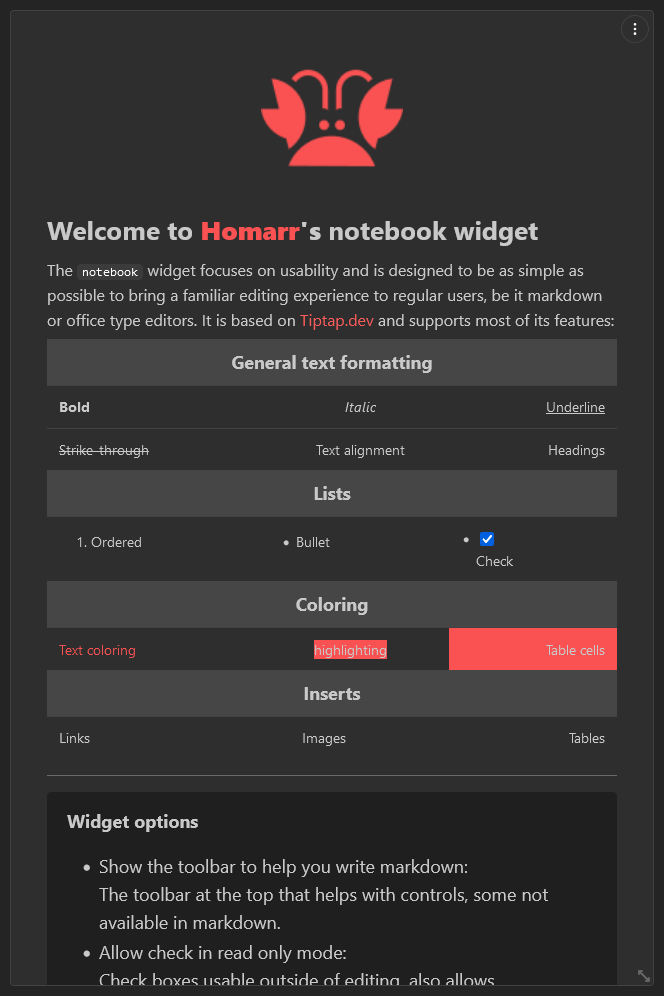 The notebook widget focuses on usability and is designed to be as simple as possible to bring a familiar editing experience to regular users. It is based on Tiptap.dev and supports most of its features.